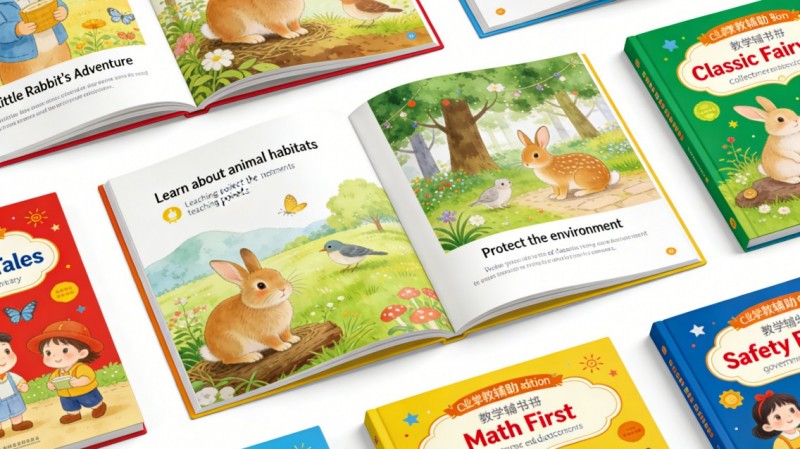 Livros ilustrados infantis de alta qualidade, edições clássicas em cores, livros educativos, brochuras educativas. A impressora de quatro cores WIN garante texto nítido, imagens vívidas e qualidade estável para editores e instituições educacionais.