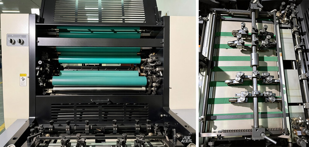 A impressora offset de folha única de papel grosso A3 grande se destaca por seus recursos de primeira linha que a tornam confiável e eficiente. Ele tem uma estrutura mecânica resistente – base integral de ferro fundido, placas laterais e rolos – por isso é forte, rígido, resistente ao desgaste e absorvente de choque. Isso significa que ele funciona perfeitamente mesmo em altas velocidades, mantendo sempre a pressão de impressão consistente. Os cilindros de impressão cromados resistem muito bem ao desgaste, ajudando a máquina a durar mais e reduzindo os custos de manutenção diária. Rolamentos de alta precisão e engrenagens helicoidais aterradas tornam a transmissão de energia estável e suave, sem tremores ou falhas. A segurança também é uma prioridade – dispositivos de segurança são incorporados na montagem da placa, na limpeza, nas tampas de proteção e no ajuste da porta para manter a segurança dos operadores e da máquina. O controle pneumático da embreagem e dos rolos de tinta torna a operação mais confiável, sem problemas inesperados. O mecanismo de montagem da placa possui posicionamento e tensionamento rápidos, economizando tempo na configuração. Suas peças de transporte de papel – cabeçote de alimentação, mesa de papel, guia frontal e pinças – lidam com todos os tipos de papel, do grosso ao fino. O alimentador de papel com braço oscilante mantém a suavidade durante trabalhos em alta velocidade, e os cilindros de chapa e blanqueta com anéis de suporte garantem impressões de alta qualidade em alta velocidade. As garras de mola dupla mantêm o papel firme, sem escorregar, mesmo durante longos trabalhos de impressão. Além disso, o sistema semiautomático de limpeza do rolo de tinta é fácil de usar: reduz o tempo de limpeza, acelera as mudanças de cor da tinta, alivia a carga de trabalho e aumenta a eficiência da produção. Possui ainda controle PLC e tela sensível ao toque com interface simples e fácil de usar para os operadores.